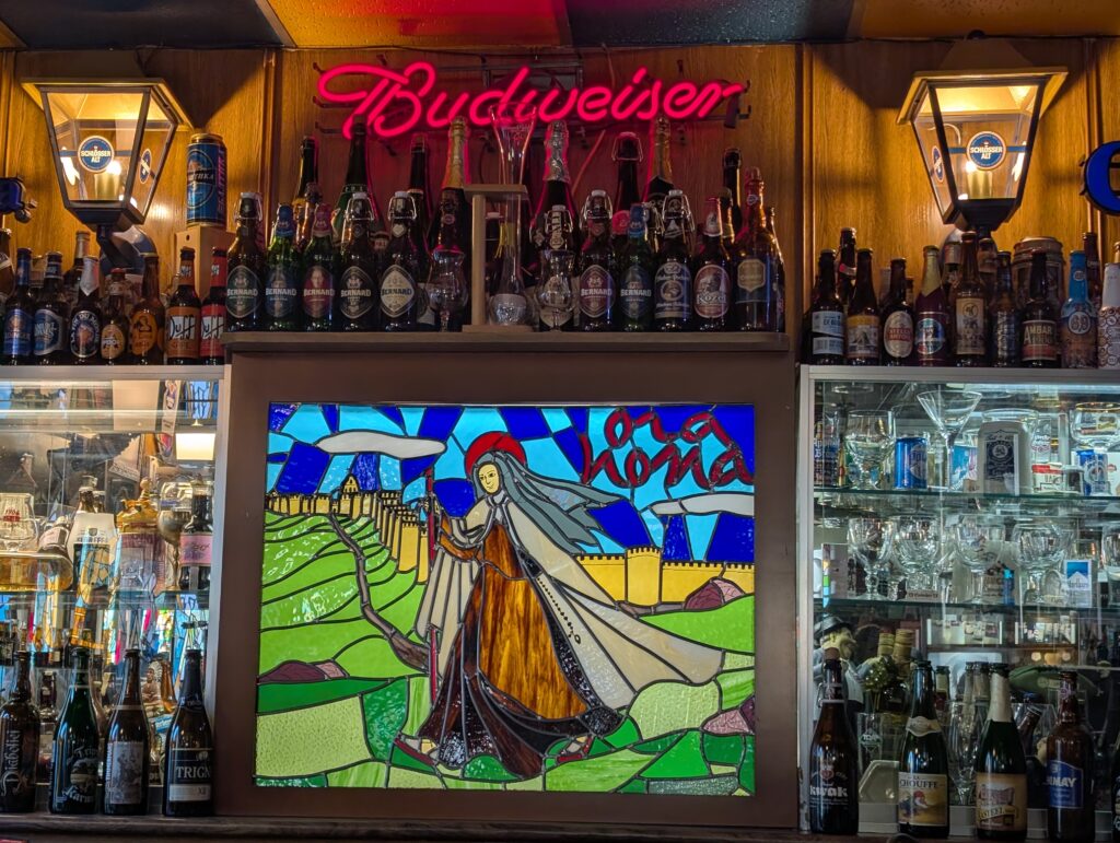 This past November, my husband Andy and I were fortunate to be able to travel to Spain, and we spent some time in Ávila. We went first to the Basilica, then we stopped at a tiny cafe for coffee and a bathroom break, on the way to Teresa’s convent. In this cafe, I found this delightful stained glass depicting the saint, centered directly below a Budweiser sign. LoL.