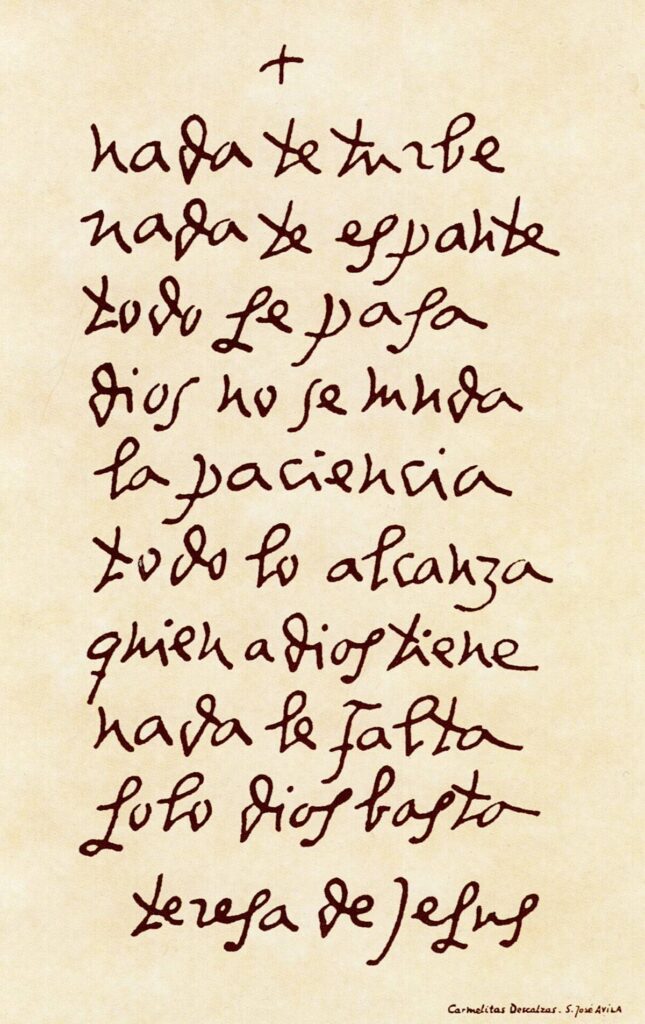 So, when I was at her convent, I found that they were selling reproductions of it – of course I bought a copy that I have scanned and is shown here. I am fairly certain that this is Teresa’s handwriting, because there were a couple of other documents posted at the convent in this same distinctive script. In addition, you can see an image of a letter she wrote on the Wikipedia page on Teresa of Ávila in this same handwriting. If not actually written by her, it would have been copied down by one of Teresa’s Carmelite nuns somwhere down the line. The quote in Spanish is: