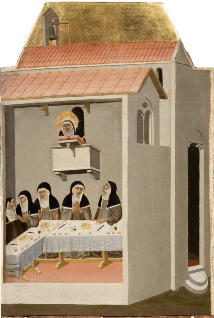 Image 2: Detail from Polyptych of the life of Umiltà, Pietro Lorenzetti,1330-1335, Umiltà reads to her fellow nuns during meal at refrectory in convent of Santa Perpetua.