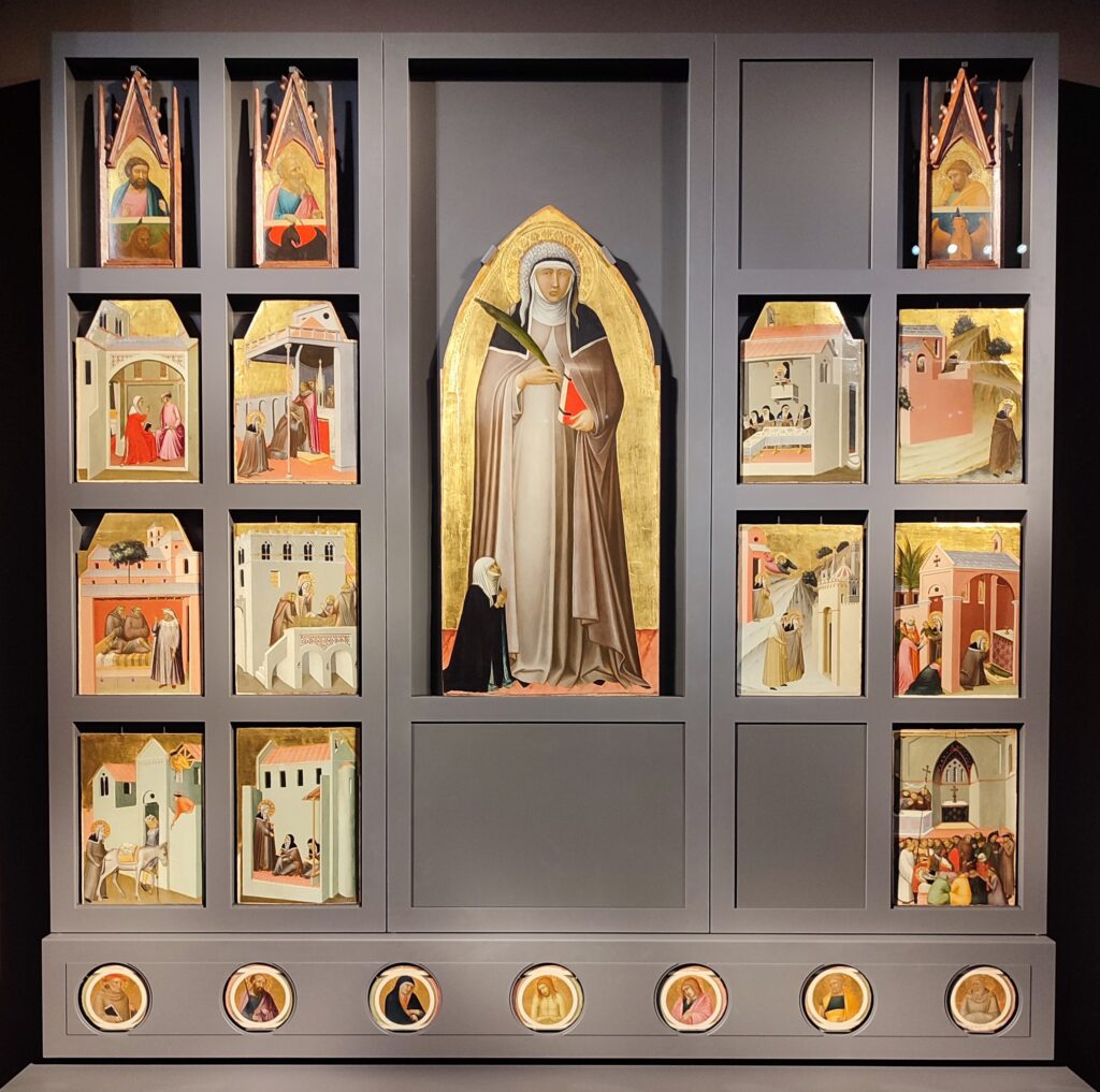 Pietro Lorenzetti painted a gorgeous polyptych altarpiece (circa 1330-1335) to commemorate Umiltà’s burial in the church of San Giovanni Evangelista in Florence, the convent she had founded in 1282 and of which she was the abbess until her death in 1310. Hagiographic altarpieces originated in the Byzantine world, were closely associated with the veneration of relics, and became popular in Italy beginning in the 13th century. Similar to other such pieces of artwork, this polyptych illustrates significant episodes in Saint Umiltà’s life and the stories and legends that were passed down about her.