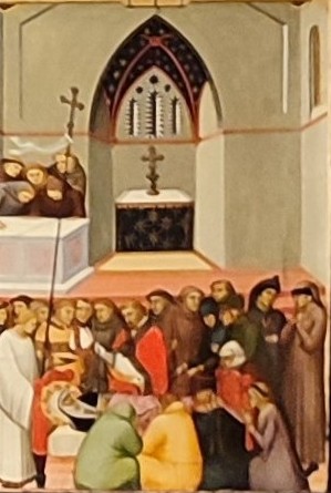 Image 7: Detail from Polyptych of the life of Umiltà, Pietro Lorenzetti,1330-1335, Umiltà heals a sick nun. This is one of the two panels that are on exhibit at the Staatliche Museen, Gemäldegalerie in Berlin.