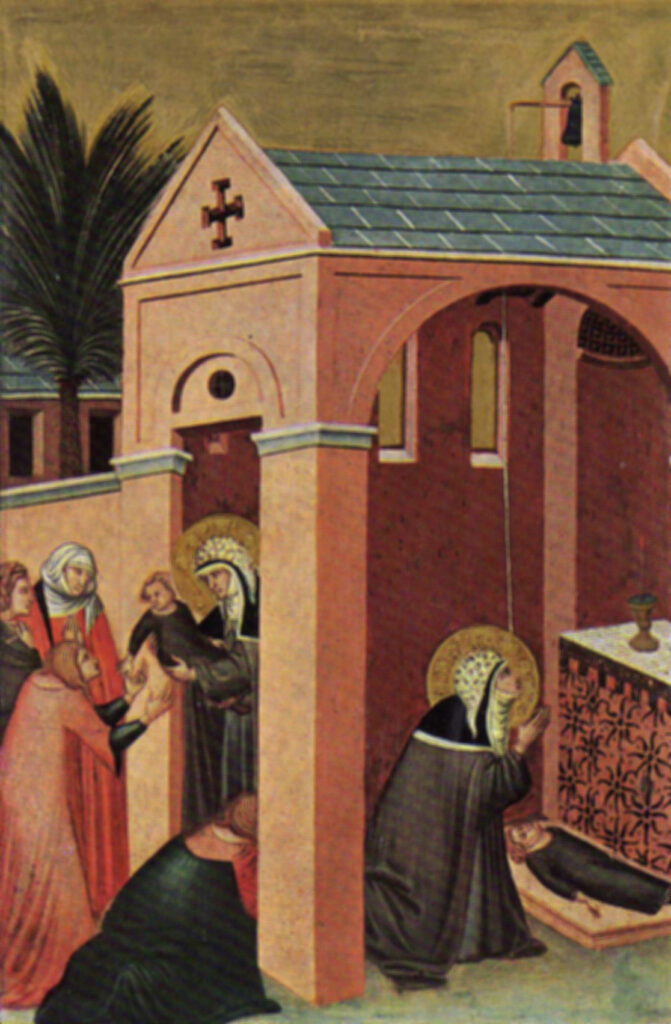 Reference 3 provides the following description of the scenes of her life, “The stories surrounding the central image recount Saint Humility’s life, from the moment she chooses to don the religious habit before her conversion, to the miracles she worked in the convent in Faenza, to her journey to Florence where, in 1282, she founded the monastery of San Giovanni Evangelista just outside the city walls, until her death and funeral service presided over by the priest. The lively narrative of the scenes, set in architectural environments and landscapes which abound with realistic details, is clear and informative, reiterating the educational purpose that images played in an era when literacy was a skill known only to the few.”